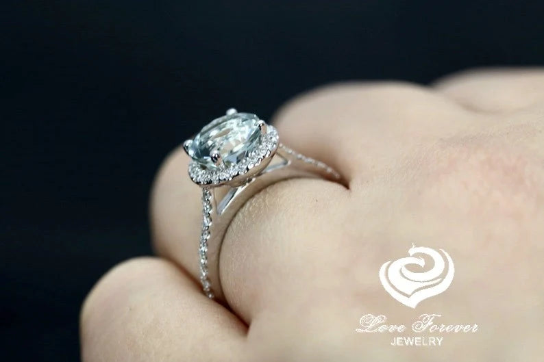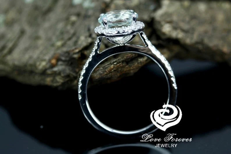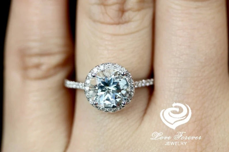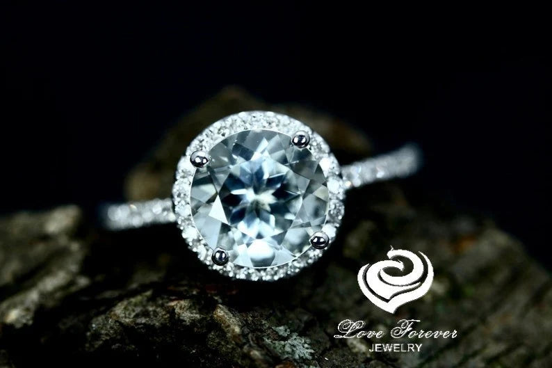 14k White Gold Diamond Ring Engagement Ring 8mm/1.80 Carats Round Cut Aquamarine Halo Diamond Wedding Ring Anniversary Ring Aquamarine Ring