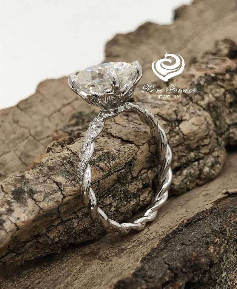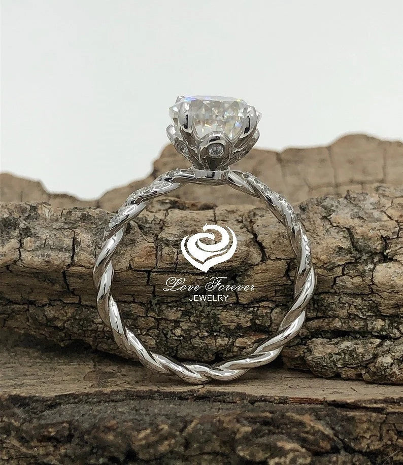 Moissanite is an amazing that resembles a diamond in nearly every sense. To the naked eye it appears just as, if not even more, brilliant than it’s expensive natural counterpart. in a simple traditional thermal probe, this stone even shows up a diamond. When it comes to the Moissanite vs. diamond battle, test yourself and you will see it is nearly impossible to tell the difference. It can truly be your own secret. No scratching or buffing ever and the stone will never turn cloudy or dull. All stones used are only premium cut, fairly traded, and/or conflict-free! Our accent diamonds are always natural. We promise that you engagement ring will stand out everywhere you go, a piece of art that sparkles from across the room even by candlelight. We can make a Matching Perfect fit Wedding Band for this setting as well.