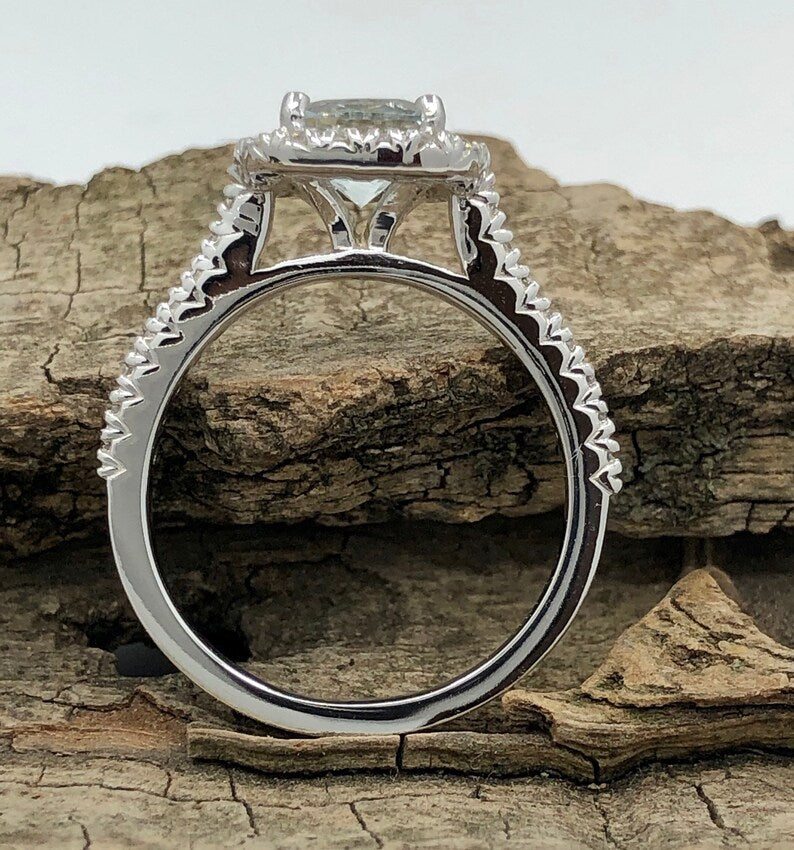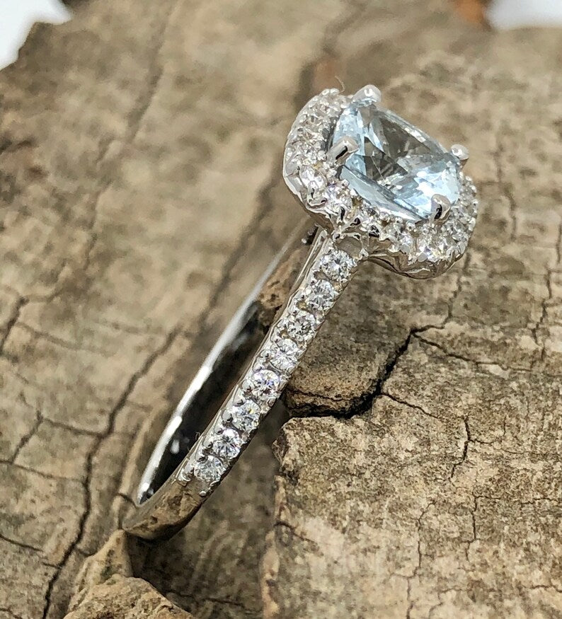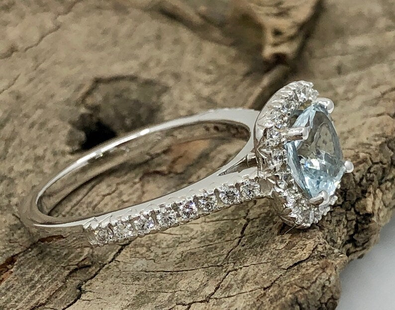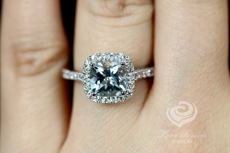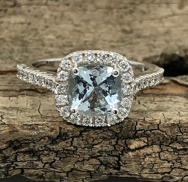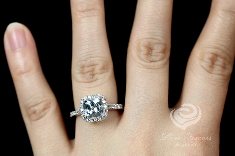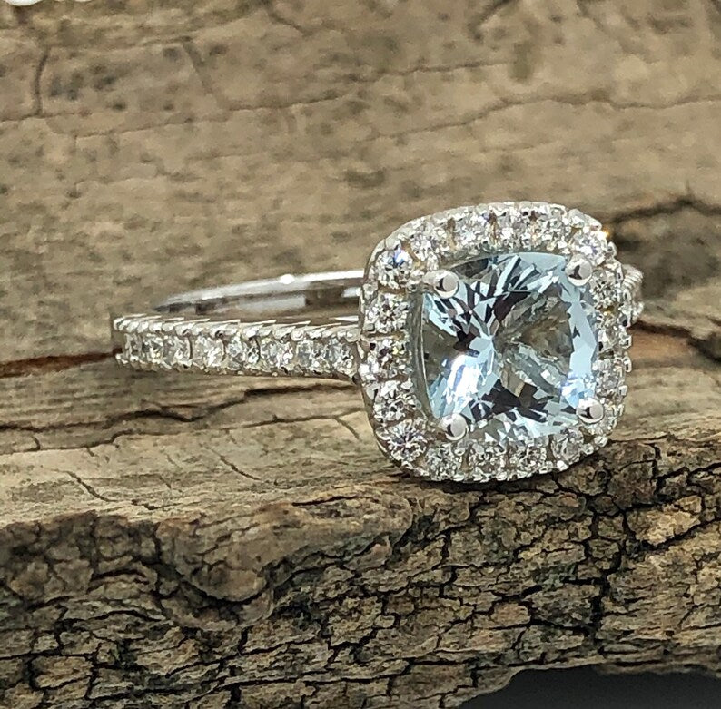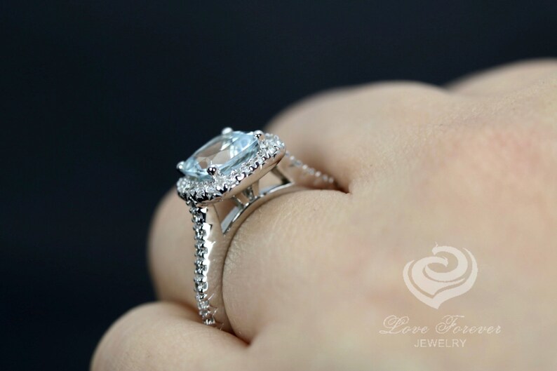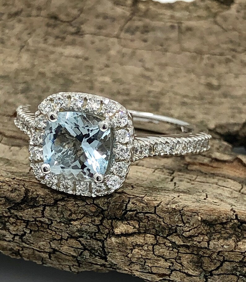 Cushion Engagement Ring 14k White Gold Diamond Ring 7mm/1.40 Carats Cushion Cut Aquamarine Halo Diamond Ring Anniversary Ring