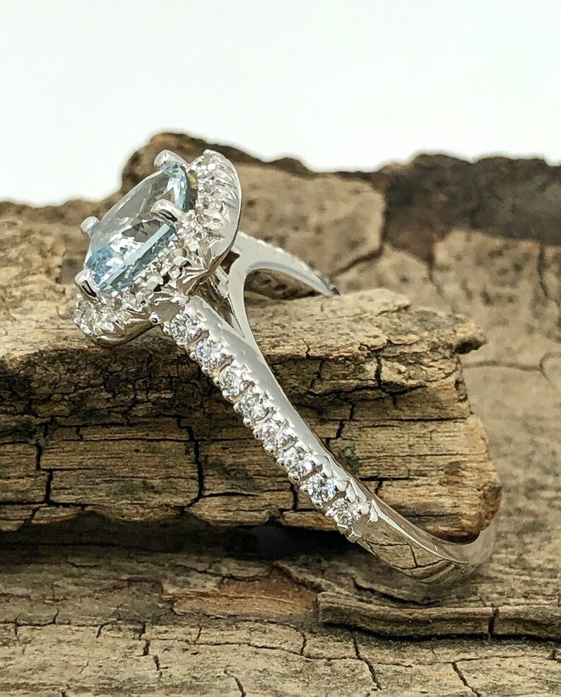 Aquamarine, the dazzlingly blue birthstone for the month of March, has one of the most unique hues amongst precious stones. Its rich colour has long been a symbol of youthfulness, good health and hope. Aquamarine is generally paired with metals like rose gold, yellow gold or white gold when set in fine jewellery. The colour combination works well together and can add a special, summery feel to any outfit. All gemstones used are only premium cut, fairly traded, and/or conflict-free! Our accent diamonds are always natural. We promise that your engagement ring will stand out everywhere you go, a piece of art that sparkles from across the room even by candlelight.